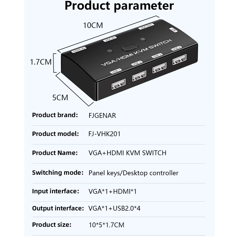 Switch 2 puerto VGA, 1 HDMI KVM, HD 1920*1080p Para 2PC Marca: FJGEARModelo: FJ-VHK201Entrada: VGA*1 + HDMI*1Salida: VGA*1+USB2.0*4Resolución: 1920*1080/60HzCertificado: FCC... Leer más...