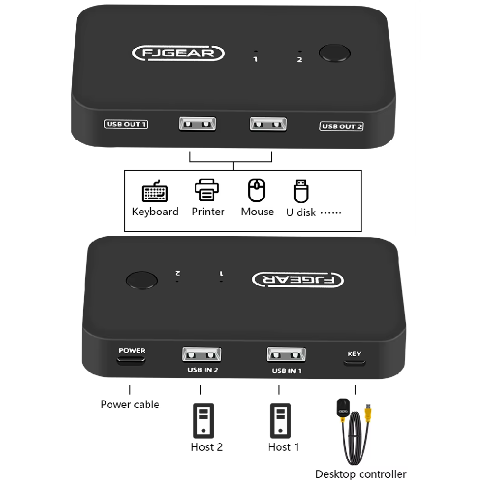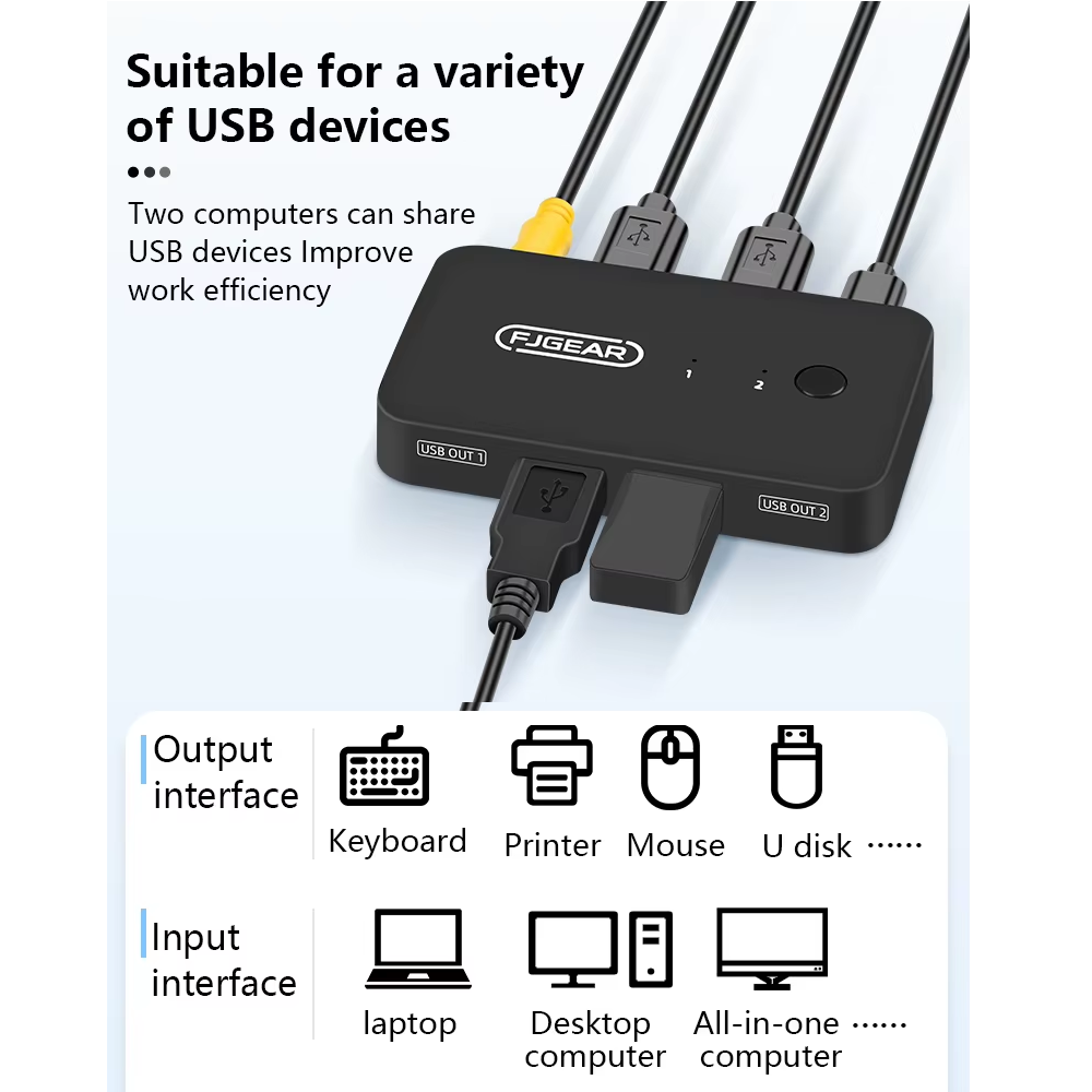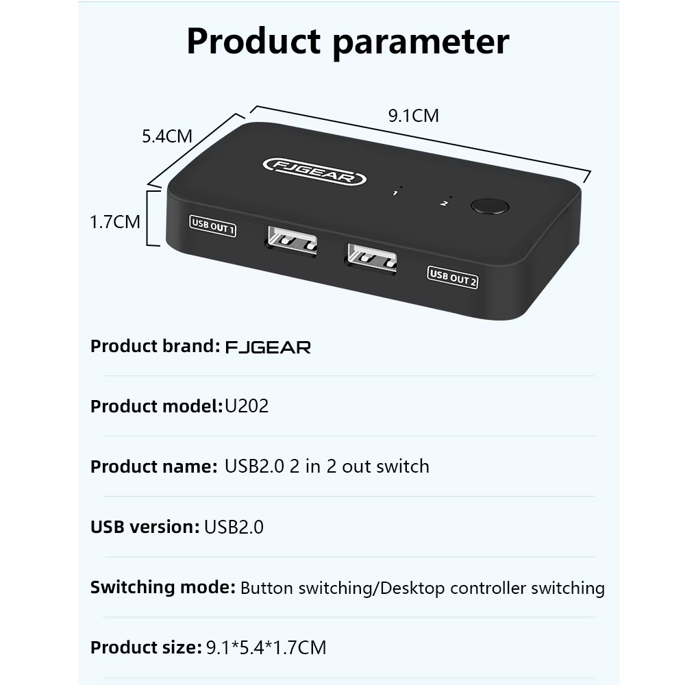 Switch USB2.0 2 Entradas 2 Salidas 2PC 1 teclado y Mouse Marca: FJGEARModelo: FJ-U202Salida: USB 2.0Material: ABSTipo: interruptor de USBSuministro... Leer más...